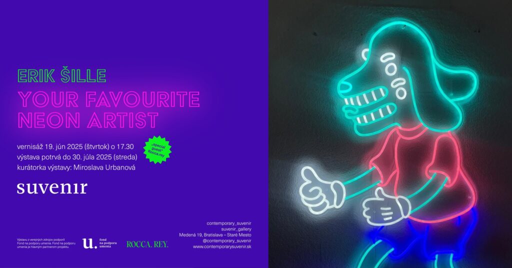Výstava YOUR FAVOURITE NEON ARTIST od Erika Šilleho v Contemporary Suvenir pôsobí ako svetelný výkrik uprostred mesta – mestská džungľa preliata farbami, ktoré pripomínajú neónové pútače starých kín, barov aj nočných ulíc. Šille tu opäť potvrdzuje, že vie pracovať s vizuálnym napätím, kde sa urbánne motívy miešajú s poetickými zásahmi, iróniou a jemne podvratným humorom.