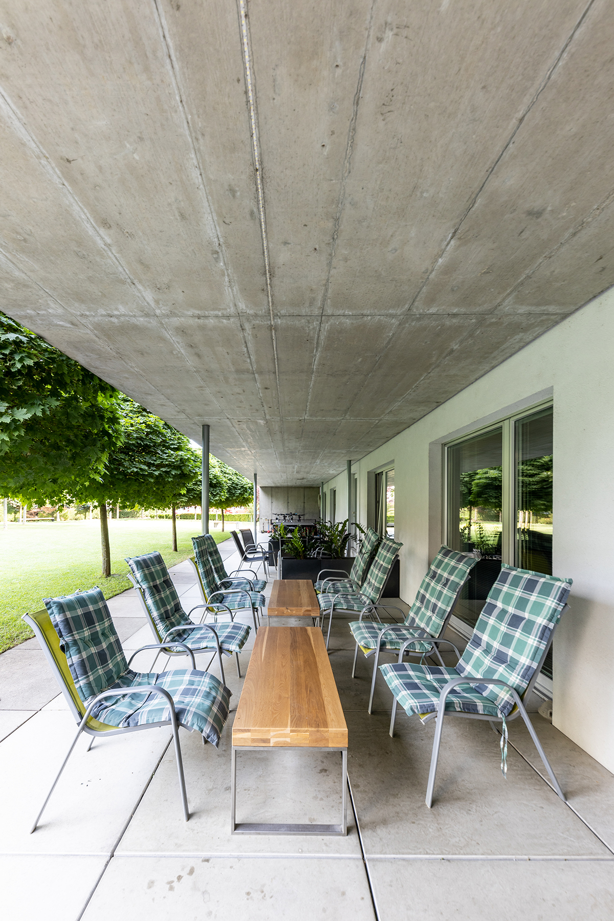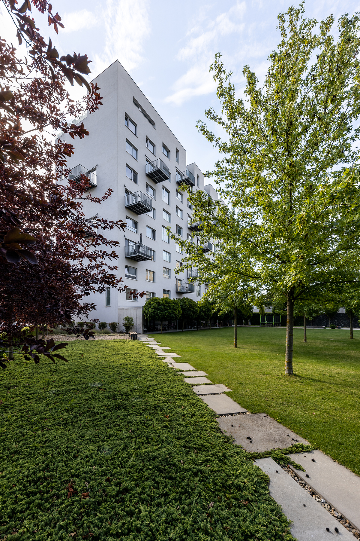 Sprevádza ma majiteľ domu (celého). Pri vstupe ma prekvapuje názov bytovky – White house. Tam, kde bola kočikáreň, je teraz recepcia a kaviareň, ktorá je kaviarňou len pre obyvateľov domu, prípadne ich návštevy. Rovnako ako fitnes, wellness a aj celá záhrada na západnej strane bytovky. S majiteľom sedíme v chládku pod betónovým tubusom zastrešenia a košatými korunami stromov, debatujeme. Nerušený výhľad na anglický trávnik a stromami zatienený výhľad na panelákové susedstvo. Hotelový pocit.V celej bytovke nenachádzam miesto ani moment, kde by bolo na prvú cítiť, že je to ešte stále panelák. Ak to bol zámer, podarilo sa. (Bol.) Azda iba komicky malé výťahy napovedajú, že tu boli isté limity.