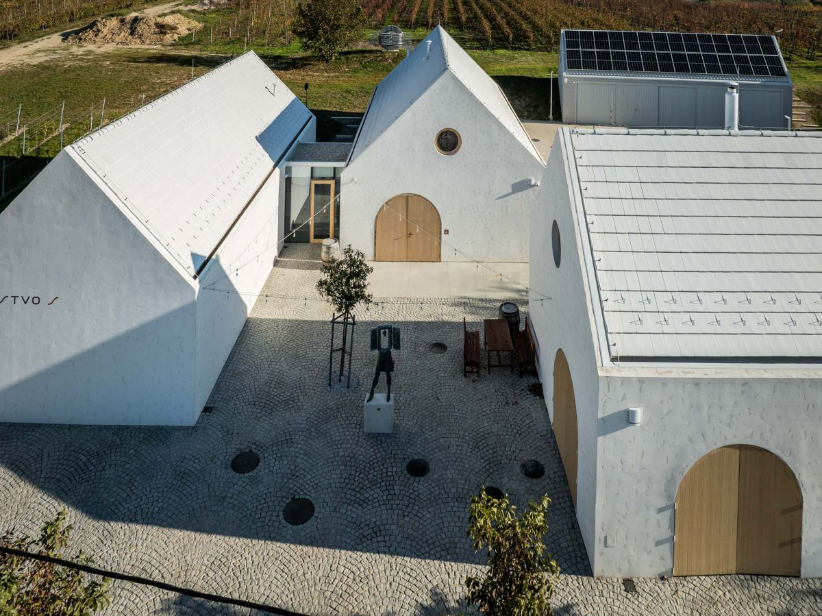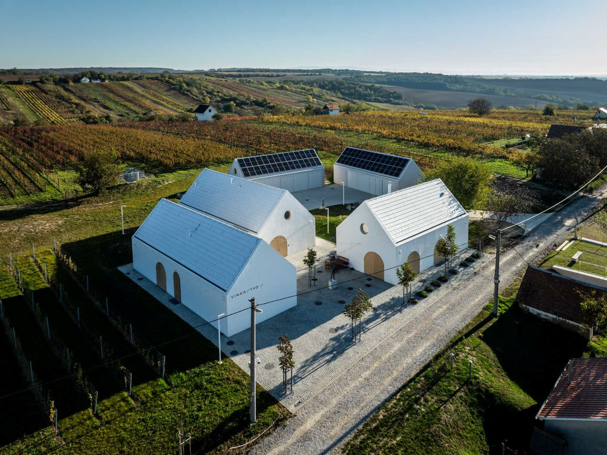 Ich tvarovanie nadväzuje na tradičné klenbové priestory vínnych pivníc a na brány remeselníckych či vinohradníckych stavieb. Na strechách bola použitá biela krytina, ktorá umocňuje kompaktnosť objektov a zároveň prispieva k energetickej efektivite. V letných mesiacoch sa podstrešie neprehrieva, čo má pozitívny vplyv na skladovanie vína aj pracovné podmienky zamestnancov. Aj z toho dôvodu nie sú v podkroví strešné okná – prirodzené svetlo zabezpečujú len subtílne kruhové okná v štítových stenách, čím sa zachováva čistota architektonického výrazu.