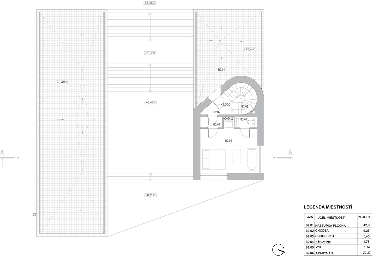 Hmota bloku A je uložená rovnobežne s juhovýchodnou hranicou parcely vo vzdialenosti 3 m od nej. Jej funkčnú náplň predstavujú spoločenské priestory a zázemie. Na vstup do objektu, ktorý je situovaný na severnej strane, nadväzuje recepcia a hygienické zázemie. Dominantným priestorom, ktorý má väčšiu svetlú výšku a disponuje výhľadom do krajiny, je spoločenská miestnosť s barom, na ktorý nadväzuje kuchyňa. Keďže ide o zariadenie prechodného ubytovania s kapacitou do 10 osôb, sú priestory zázemia dimenzované ako naozaj funkčné minimum. Zo spoločenskej časti je možné expandovať dianie do nadväzujúceho nádvoria. Plochá strecha slúži ako terasa na rôzne podujatia.