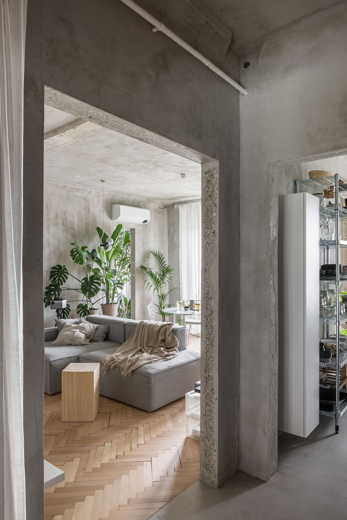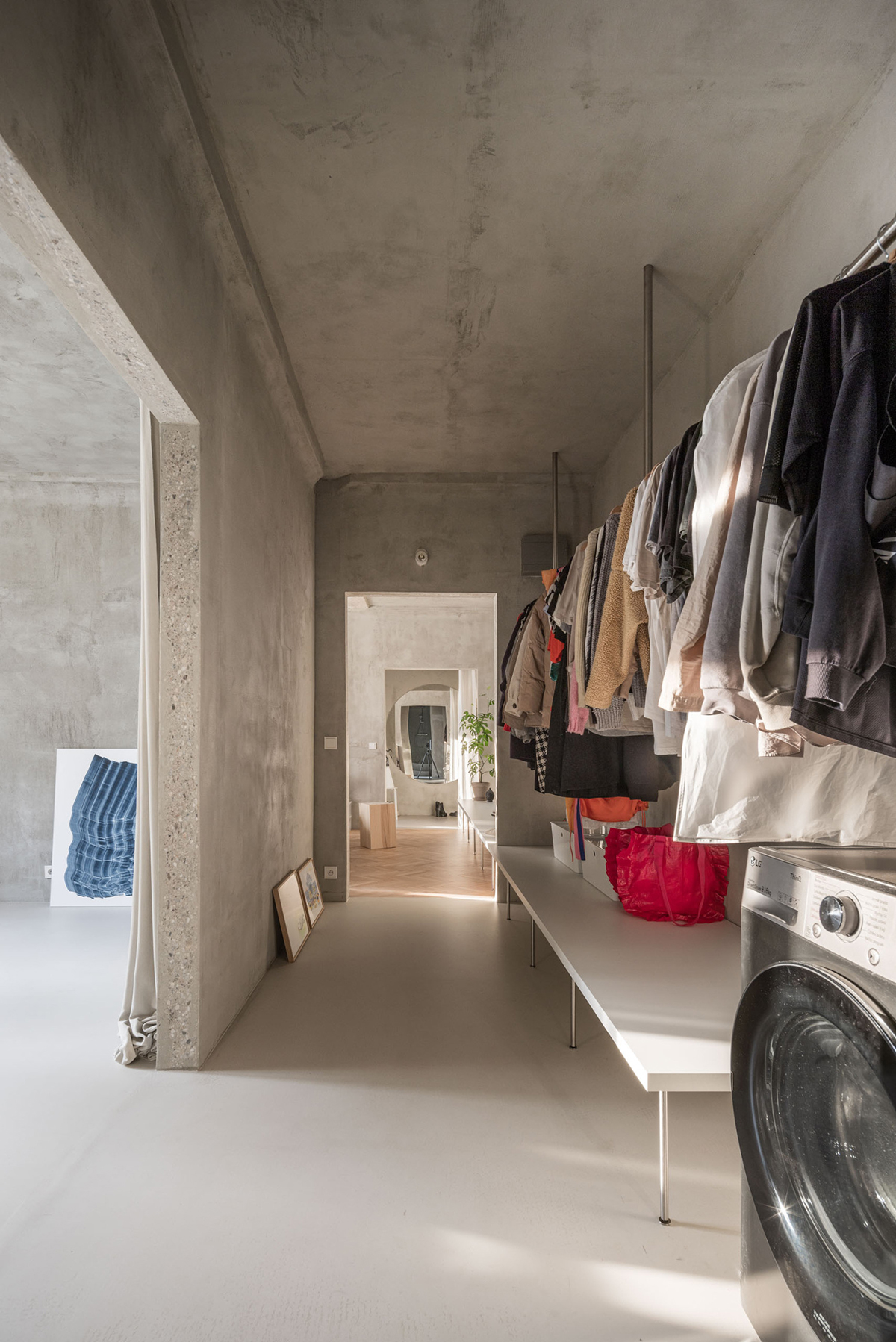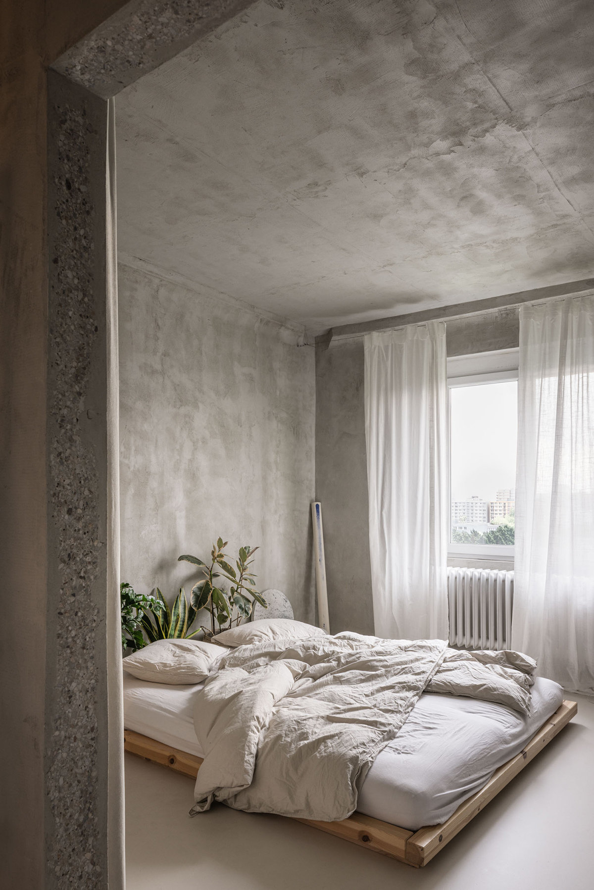 Byt bol veľmi štruktúrovaný, 3-izbový s ôsmimi dverami mimo vstupných. Rigidné členenie miestností sme sa snažili narušiť, preto všetky dvere okrem tých na WC išli preč. Miestnosti sme zoradili tak, aby sa funkcie jemne premiešavali. Dennú časť, ktorá tvorila iba 40 % bytu, sme sa pokúsili dostať čo najďalej do nočnej, a to vizuálne aj funkčne pomocou rôznych perforácií či prakticky preplávajúcim mobiliárom. Pridali sme druhú komunikačnú os otvormi v stenách dennej zóny. Snažili sme sa nájsť balans medzi otvorenosťou, adaptáciou na súčasné potreby a financiami.