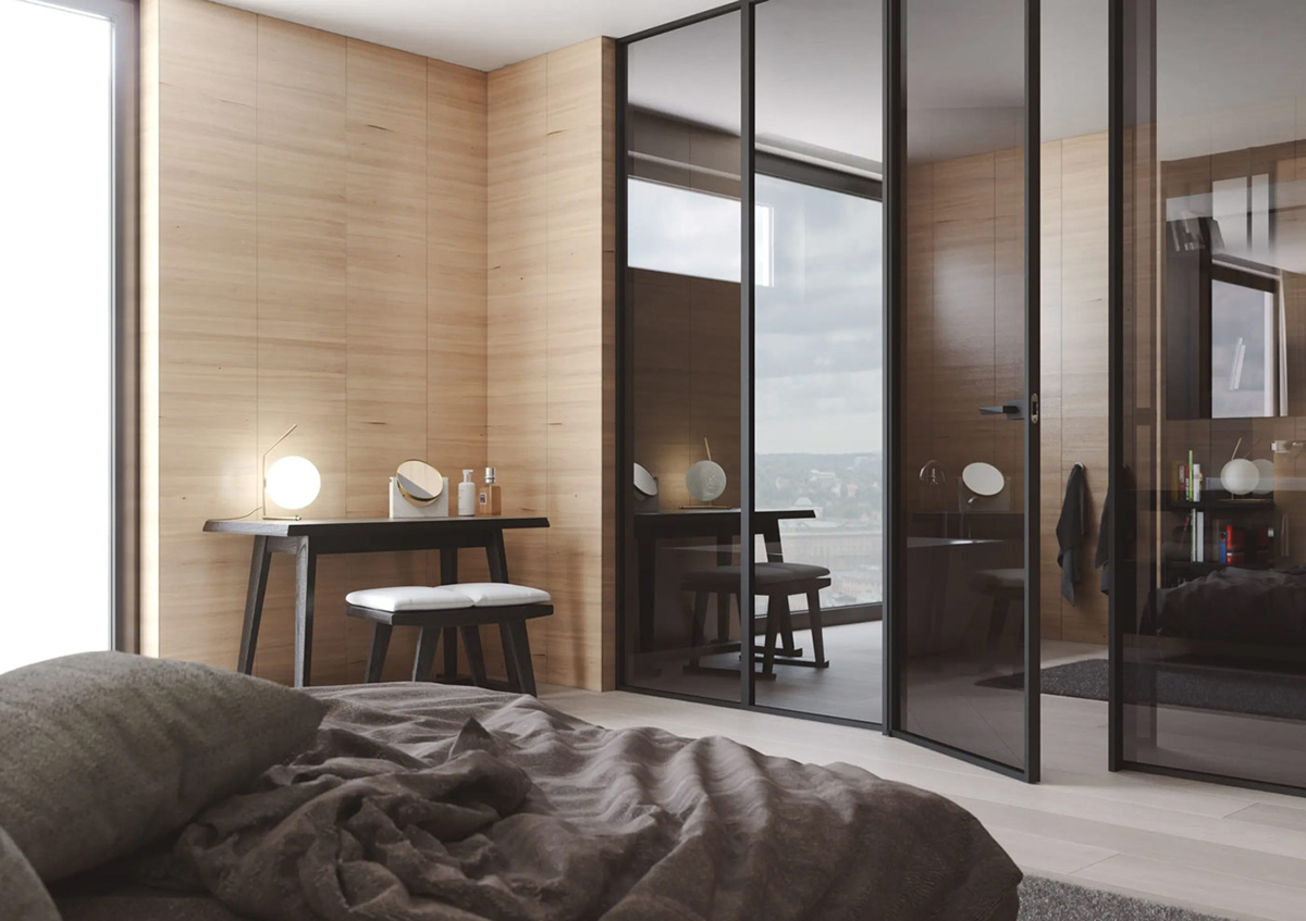 Dverný rám z eloxovaného hliníka je možné povrchovo upraviť podľa vzorkovníkov farieb RAL K7 a NCS. Na výber je aj dostatok typov skiel vrátane nepriehľadných, ktoré dokážu vytvoriť intímne prostredie a dvere tak možno zmysluplne použiť na oddelenie kúpeľne alebo šatne od spálne.